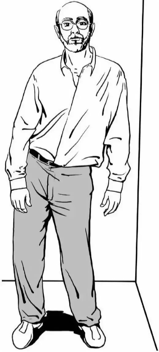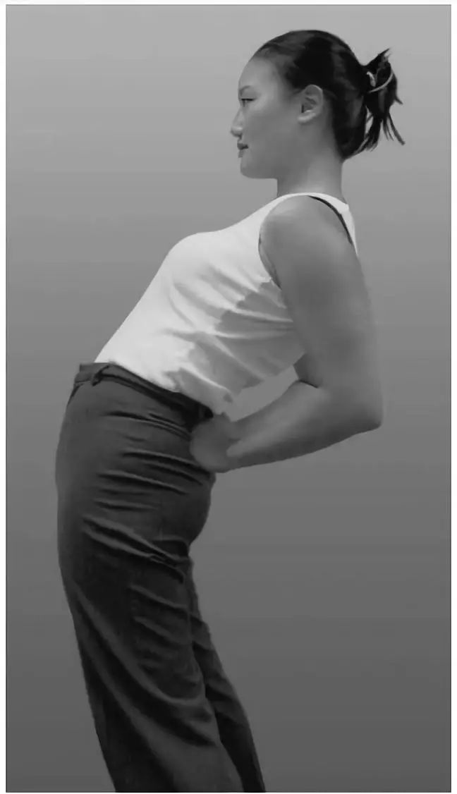 双脚稍分开,站直,保持舒服体位。双手置于腰部髂后上棘处,双手固定住骨盆然后后仰。患者尽可能后仰(图9)。该练习重复10次。对于错位型和功能障碍型患者的效果与俯卧位后伸相似。在错位型患者中,站立位后伸可以减轻髓核物质在椎间关节后部的堆积。该方法对于预防长期久坐时或久坐后的腰背痛发作非常重要,同时,如果在感觉疼痛之前就进行该练习,效果同样很好。