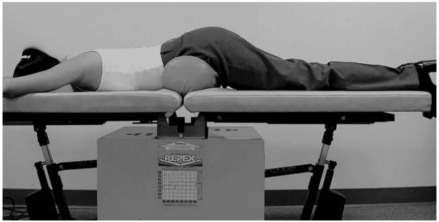 在多数错位患者中,例如腰椎后凸患者,他们往往不能忍受俯卧位,因而需要垫几个枕头(图6)。在存在功能障碍的情况下,后伸缺乏足以导致不能俯卧,因为此时的软组织已经挛缩,降低了ROM,而俯卧时产生的后伸应力造成疼痛。