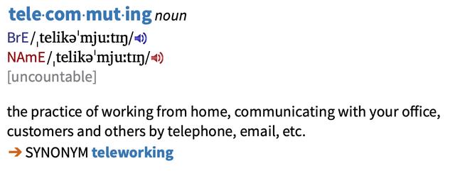当前的“在家工作”是指你有上班单位,但是因为疫情的原因而上不了班,只能待在家里进行“远程办公”,说的得严谨一点,这种模式应该叫“家庭远程办公”,英语中有个专业的词,叫:telecommuting,来看看它的定义: