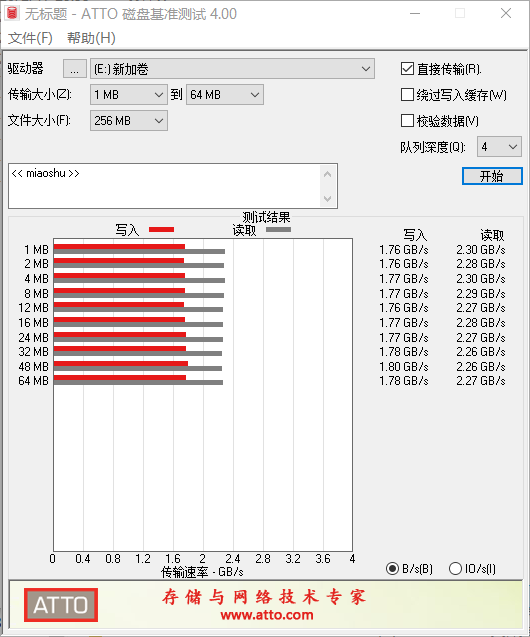 ATTO磁盘基准测试中,从1MB的小文件到64MB的较大文件,WD Blue SN550的读写都比较稳定,读速基本在2.3GB/s左右,写速则在1.8GB/s左右。