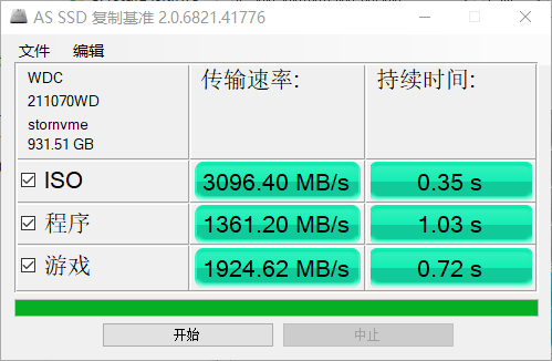 接下来测试AS SSD Benchmark 中的附加测试项目,其可以在一定程度模拟使用不同文件类型进行测试。AS SSD Benchmark 将文件类型分为三种:单个ISO文件,程序文件及游戏文件,这三种类型的而文件主要是对于硬盘的4K读写压力逐步增大,其中系统文件最大。经过测试,WD Blue SN550在ISO文件、程序和游戏传输上分别为3096MB/s、1361MB/s、1924MB/s,这样的速度自然能给日常应用带来更好的加速表现。