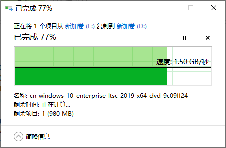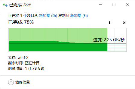 楼主也用大文件进行了拷贝测试,从别的盘向WD Blue SN550拷入数据,写入速度从一开始的峰值2.9GB/s,缓慢降到2.25GB/s稳定下来,从WD Blue SN550向别的盘拷贝文件,则基本稳定在1.5GB/s,当然这受拷入盘写入速度的限制,不过也说明了使用WD Blue SN550拷贝大文件相当快速,平时拷贝个游戏啥的也是几秒钟的事。