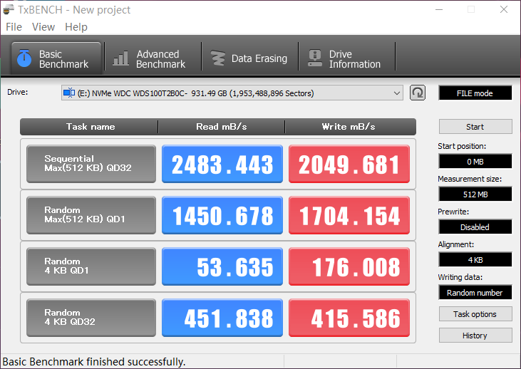 接下来是TXBENCH基准性能测试,和Crystal Disk Mark得分类似,WD Blue SN550的写入速度达到2483MB/s,读取速度2049MB/s,整体表现较为亮眼。