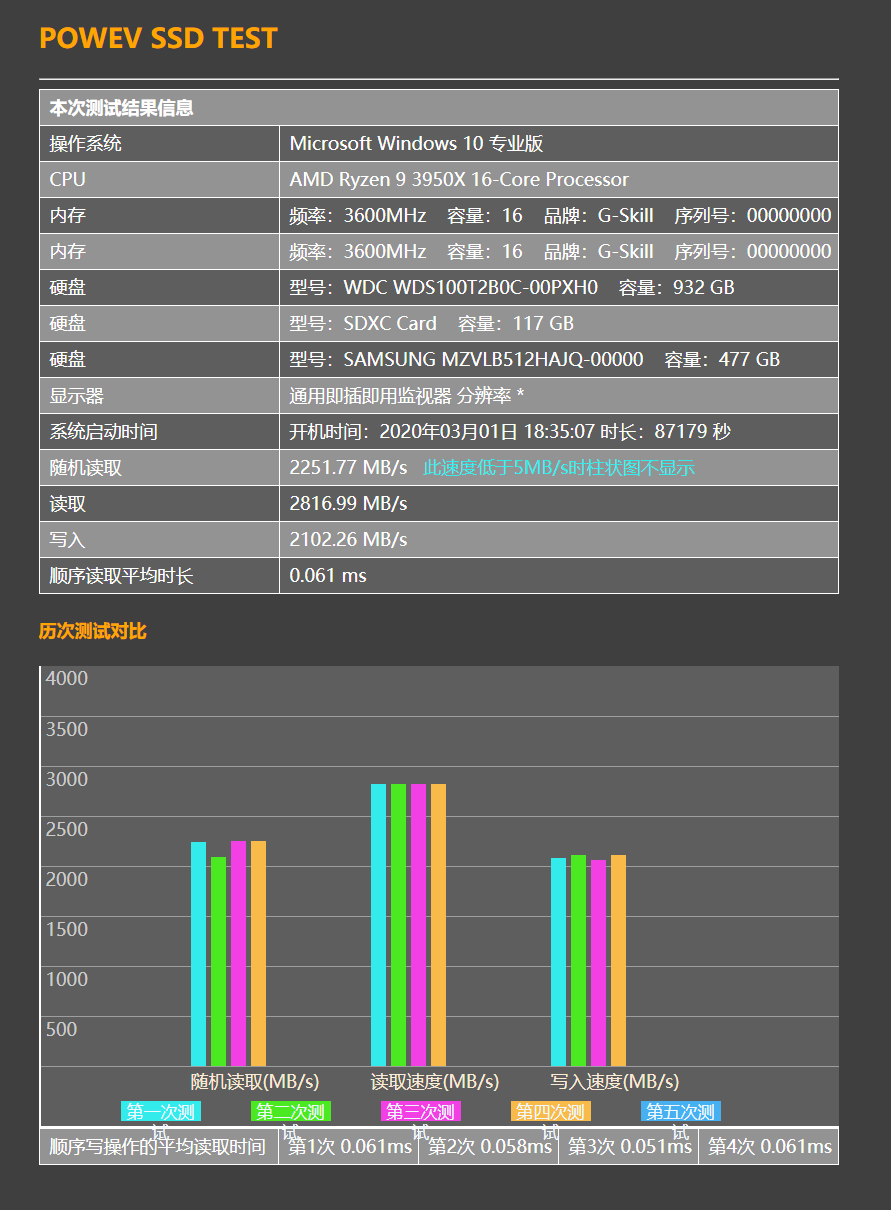先使用Windows Powershell工具编写的SSD测试程序,测得随机读取速度在2251MB/s左右,读取速度在2816MB/s左右,写入速度在2102MB/s左右。