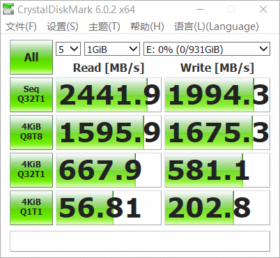 接下来是Crystal Disk Mark,WD Blue SN550得到的数据比较接近官方标称数据。写入速度达到2441MB/s,读取速度1994MB/s。