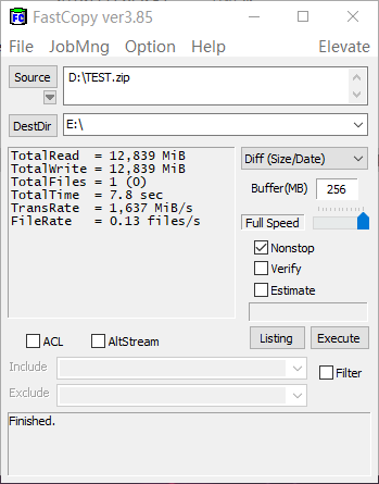 在硬盘测试软件FastCopy中,模拟平时实际文件拷贝的情况,测试从三星PM981固态硬盘向WD Blue SN550传输一个将近13GB的文件,可以看到平均传输速度为1637MB/s,用时共7.8秒。