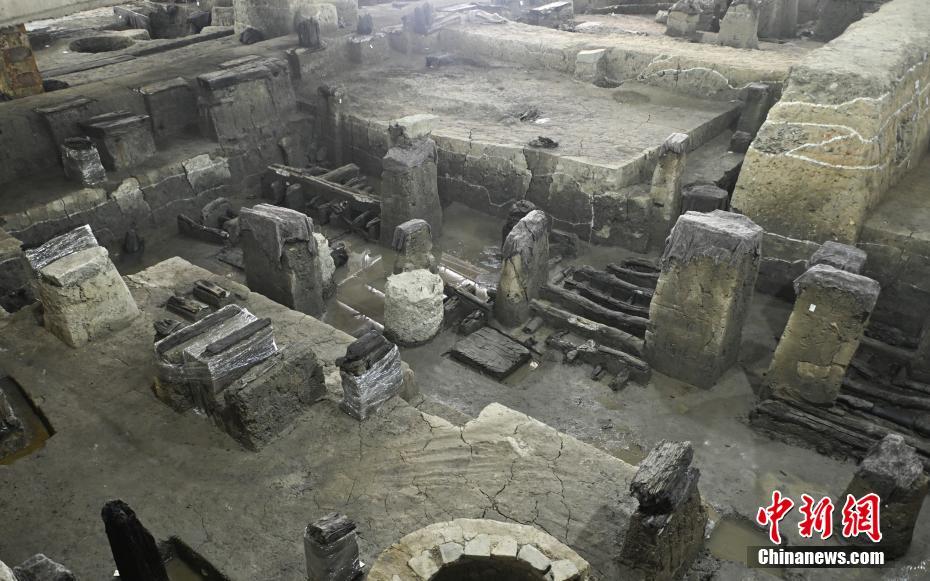 7月23日,绍兴稽中遗址中发现的越国筏状地柎基址。近日,浙江绍兴稽中遗址考古工作取得阶段性重要成果。该遗址已清理大型建筑基址、水井、灰坑等重要遗迹40余处,是首次在绍兴古城内确认存在战国时期越国的大型建筑基址,相关遗存碳十四测年距今约2500年,实证了文献记载的勾践建都历史,是越国都城考古的重大发现。中新社记者 王刚 摄