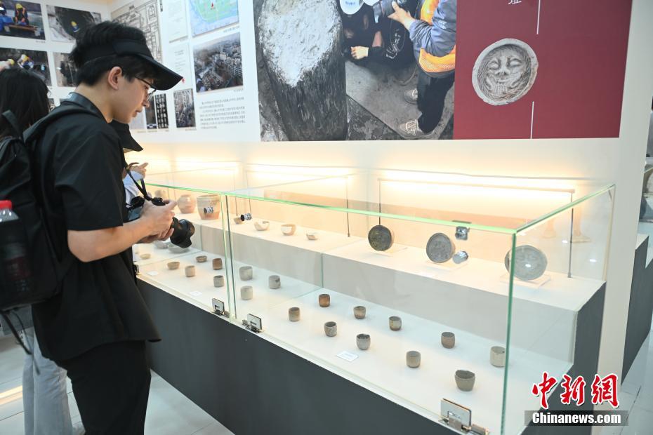7月23日,绍兴稽中遗址出土的越国原始瓷杯等文物吸引参观者。近日,浙江绍兴稽中遗址考古工作取得阶段性重要成果。该遗址已清理大型建筑基址、水井、灰坑等重要遗迹40余处,是首次在绍兴古城内确认存在战国时期越国的大型建筑基址,相关遗存碳十四测年距今约2500年,实证了文献记载的勾践建都历史,是越国都城考古的重大发现。中新社记者 王刚 摄