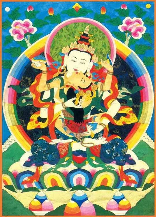 普贤如来佛父和佛母被视为宁玛派的本初佛,是几乎所有宁玛密续的来源。画中主尊身赤裸,行和合双运。赤裸象征他们的法身无相无形,因此也不受任何约束和遮蔽。法身是所有智慧形相和菩提行显示的媒介。画中其余画像全都可以被视为他们的化身。佛父体色深蓝,代表空间的广袤;佛母体色洁白,代表所有形相的源泉。这与一般的阴和阳分别象征空与形恰好相反,这说明,在证悟过程中,一个人的男性一面和女性一面都可以获得圆满,与俗义上的对立面达成和谐。双运则象征他们都完满地体验到了大乐、光明和空性。