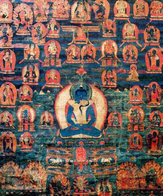 在中亚地区的所有宁玛派寺庙和静修所都可以看见普贤如来佛父和佛母的双身相。他们有的时候是作为主尊单独出现在壁画或唐卡中,有的时候则位于一群造像的顶部正中位置,以显示他们至高无上的重要性。在这幅唐卡中,他们则位于中央主尊的位置。