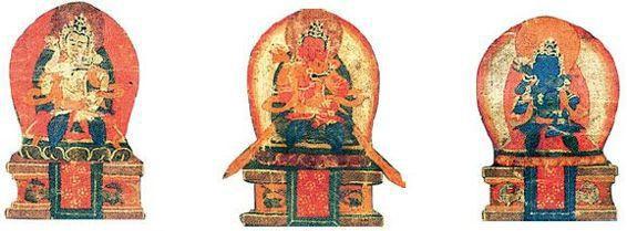 不同身色的金刚萨埵双身相,依次分别是:白色身金刚萨埵,红色身金刚萨埵,蓝色身金刚萨埵。