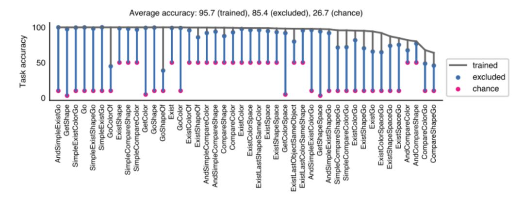 图 7. 本文提出的网络可以零样本地推广到新任务。用 44 个任务中的 43 个任务训练了 44 个网络。如图所示是 43 个已训练任务 (灰色) 的最大性能,迁移到一个没有经过训练的任务 (蓝色) 的最大性能,以及在这个任务上的机会水平(红色)。