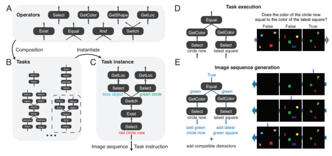 图 2. 生成综合的 COG 数据集。COG 数据集基于一系列的运算符(A), 这些运算符被组合以形成各种任务图 ( B )。( C ) 通过在任务图中指定所有运算符的属性来实例化任务。任务实例用于生成图像序列和语义任务指令。( D ) 正向传递图形和图像序列以用于正常任务执行。( E ) 生成一致的、偏差最小化的图像序列需要以反向拓扑顺序向后传递任务图,并且以反向时间顺序向后传递图像序列。