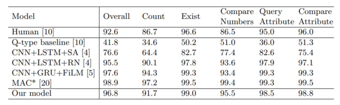 表 1. CLEVER 上的测试准确率:人类、基线、仅靠训练中的任务指令和像素输入的性能顶尖模型,以及本文提出的模型。(*)代表的是所用的预训练模型。