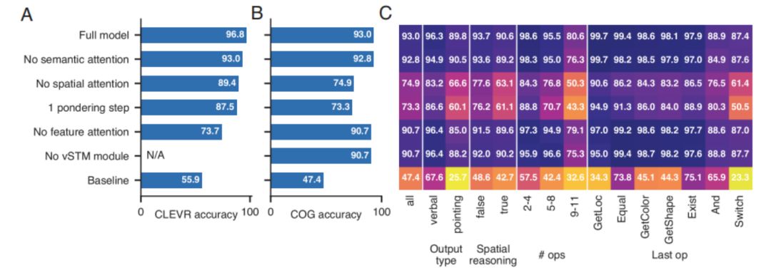 图 5. 控制变量研究。CLEVER 测试集在不同的模型上的总体准确率; A 和 B 分别是 CLEVER 数据集和 COG 数据集:CLEVR 数据集的相关模型中未包含任何 vSTM 模块。(C)基于输出类型、是否涉及空间推理、操作符的数量以及任务图中的最后一个操作符来分析 COG 的准确率。