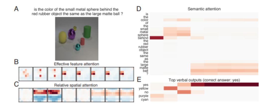 图 4. 本文提出网络的工作时的思想过程,通过可视化单个 CLEVER 样本的注意力和输出来展示。( A ) 来自 CLEVER 验证集的示例问题和图像。( B ) 每个思考步骤的有效特征注意图。(C) 相关的空间注意力图。(D) 语义注意力。( E ) 排名前 5 的语词输出。红色和蓝色分别表示较强和较弱。在同时特征注意到「小金属球」和空间注意到「位于红色橡胶目标之后」,被关注物体的颜色 (黄色) 反映在语词输出中。在后来的思考过程中,网络特征注意的是「大亚光球」,而正确的答案 (是) 出现在语词输出中。