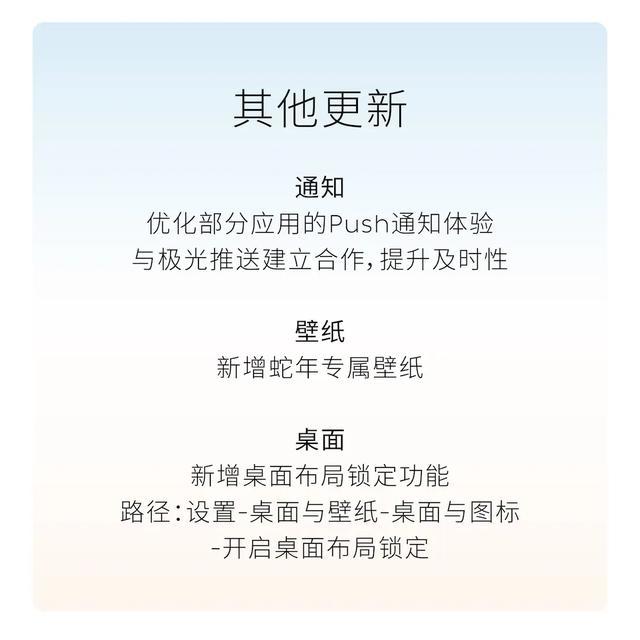 桌面:新增桌面布局锁定功能。路径: 设置-桌面与壁纸-桌面与图标-开启桌面布局锁定