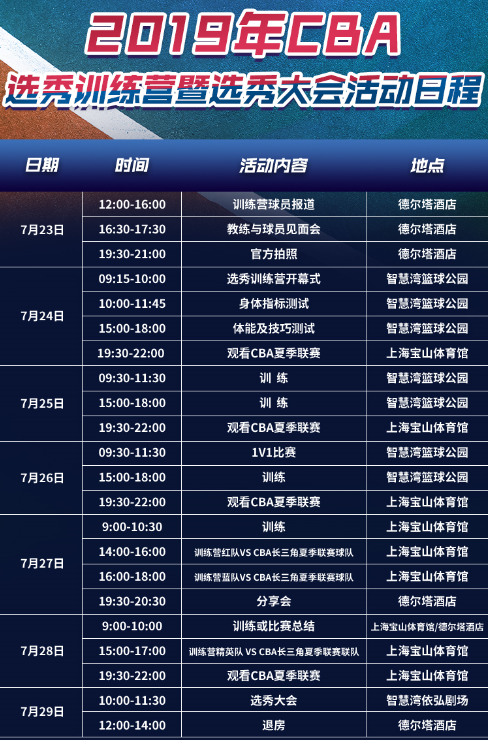 此外,今年选秀训练营与在上海进行的夏季联赛相结合,这也是史上首次。27日,参选队员将分成红蓝两队,与夏季联赛的2个小组第四球队进行实战。28日,参选球员还有机会进入“精英队”,再度与夏联球队过招。