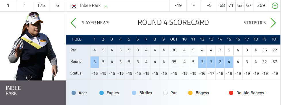 朴仁妃决赛轮出门便在一号洞抓下小鸟,随后便一度无所收获,但转场后她一鼓作气,在12-15洞连抓四鸟,将后面的球员远远甩开,单轮交出67杆总成绩269杆低于标准杆19杆,五杆优势夺冠。