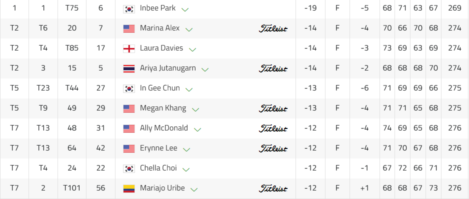 韩国美女球员田仁智本轮收获六只小鸟交上无柏忌的记分卡与美国球员梅甘-康一同再差一杆排在并列第五位;美国甜心杰西卡-科达本轮略有挣扎,交出四鸟四柏忌的成绩,总成绩280杆低于标准杆8杆排名并列第26位;小魔女魏圣美再差一杆排名并列第32位;排在世界第四名的韩国球员朴城炫决赛轮没能找到手感,吞下六个柏忌,仅在15、18洞收获两只小鸟,单轮交出76杆,总成绩284杆低于标准杆4杆排在并列第49位。