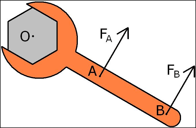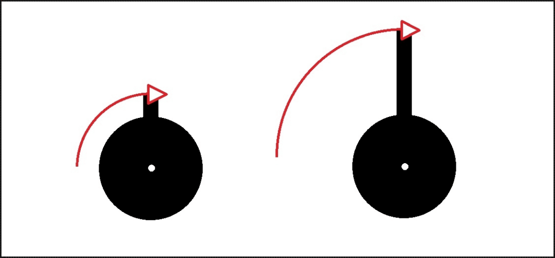 反过来,杠杆定理告诉我们,要给一个物体施加某个大小的旋转力,可以在离轴心较近的位置(小半径)施加较大的力,也可以在离轴心较远的位置(大半径)施以较小的力。只要力和力臂的乘积相同,二者最终的效果是完全一致的。