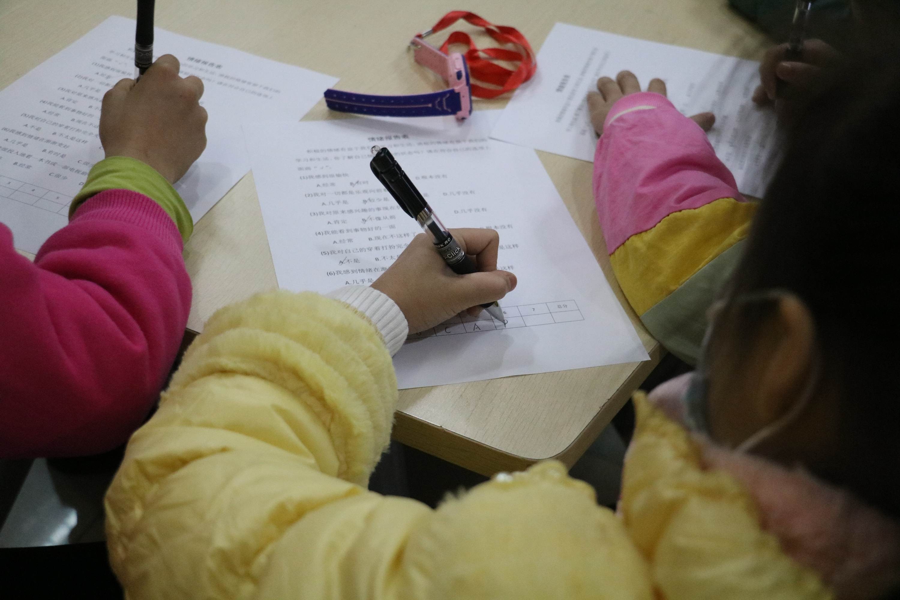 课程最后潘老师给大家分发了情绪报告表,孩子们纷纷填写了报告表,并计算了自己分数,潘老师帮大家核对了分数。