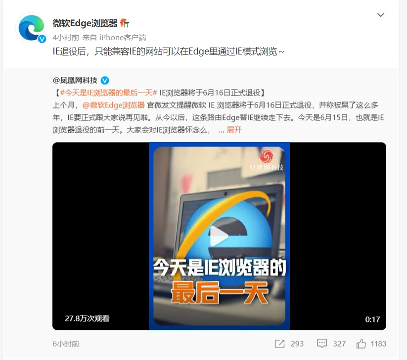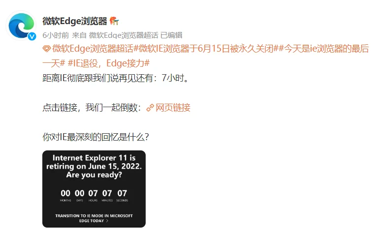 也顺带宣布了自家 IE 的死刑,老 IE 将在 2022 年 6 月 16 日停止支持, 也就是在差友们看到这篇文章的时候。