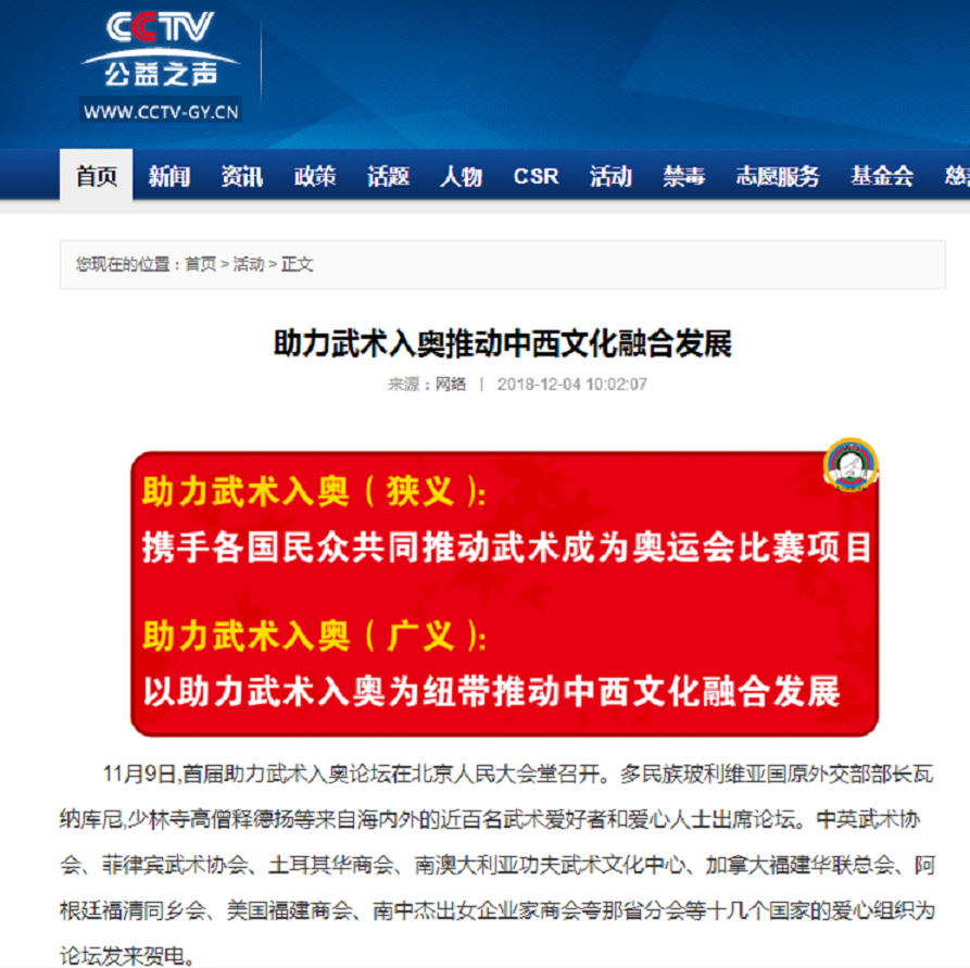 图为:CCTV报道《助力武术入奥 推动中西文化融合发展》