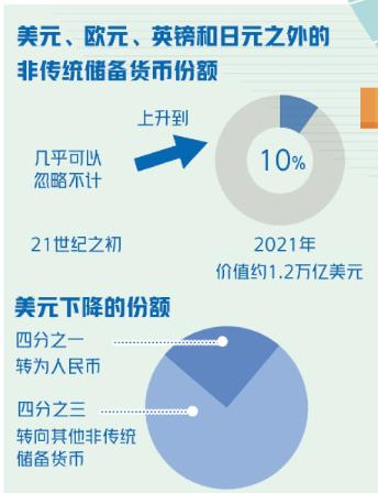 IMF指出,美元份额下降的同时,美元、欧元、英镑和日元之外的非传统储备货币份额则从21世纪之初几乎可以忽略不计上升到2021年的10%(价值约1.2万亿美元)。美元下降的份额,四分之一转为人民币,四分之三转向其他非传统储备货币。