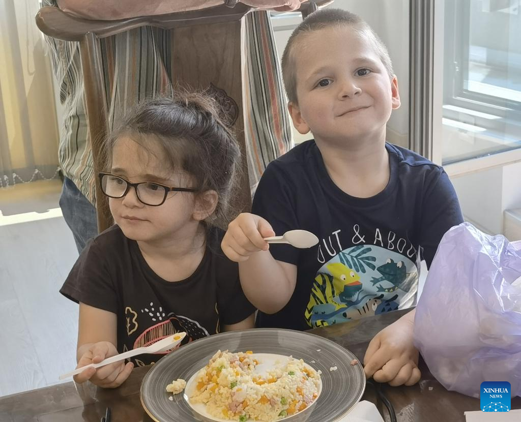 Two children taste fried rice at the Chinese Cultural Center in Sofia, Bulgaria, June 18, 2022. The Chinese Cultural Center in Sofia on Saturday provided Chinese food cooking course to local people. (Photo by Wang Fusheng/Xinhua)