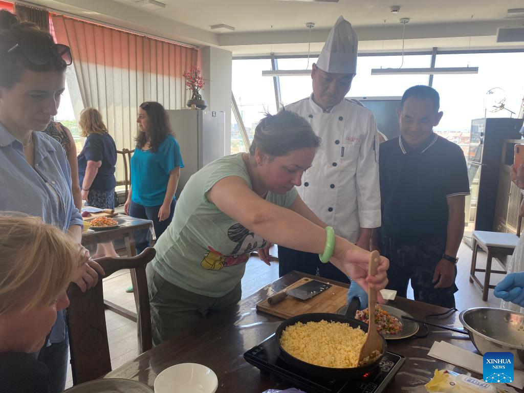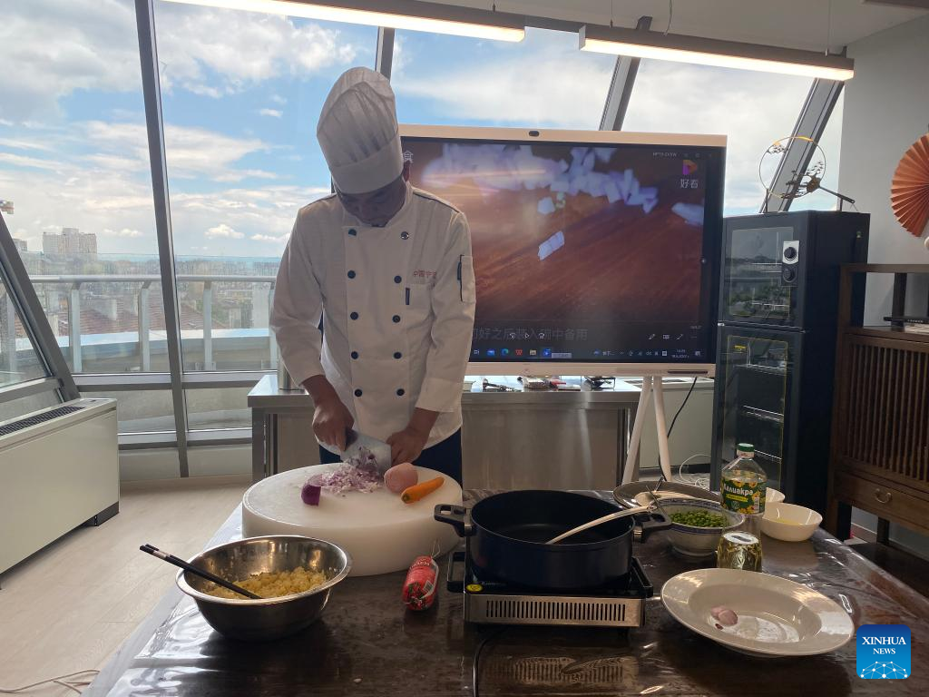 People learn Chinese cooking at the Chinese Cultural Center in Sofia, Bulgaria, June 18, 2022. The Chinese Cultural Center in Sofia on Saturday provided Chinese food cooking course to local people. (Photo by Wei Xiaochao/Xinhua)