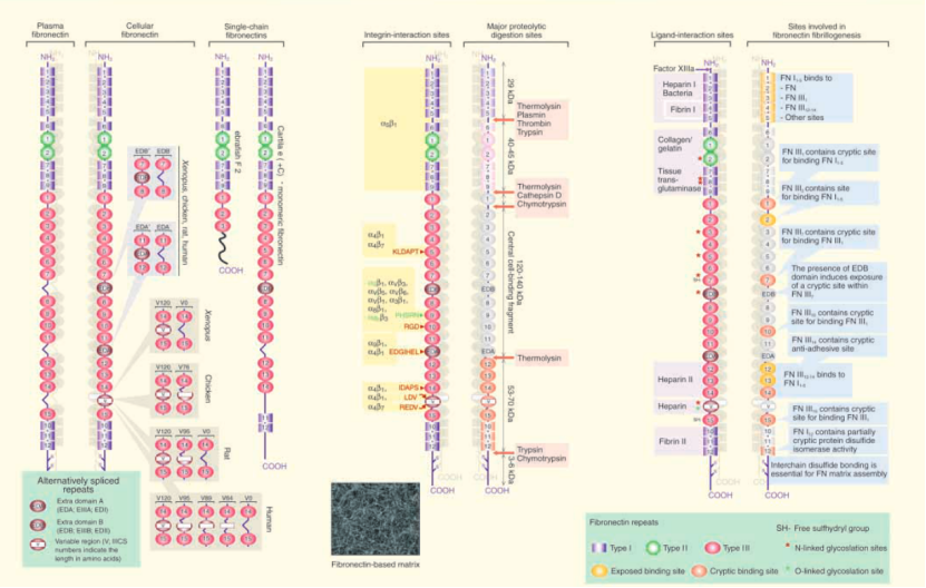 纤连蛋白则是一种广泛分布的多结构域糖蛋白,存在于大多数细胞外基质中。纤连蛋白的多结构使其能够同时与细胞表面受体(如整合素)以及胶原蛋白、蛋白多糖和其他黏附分子结合。这一特性也使得它能够介导多种细胞外基质蛋白的组装,包括I型、III型胶原和微纤维。简而言之,纤连蛋白起到连接作用,从而塑造出基质结构并发挥其功能。在皮肤上,纤连蛋白可以促进细胞粘连、增殖、分化、生长、迁移等,还可以刺激细胞分泌其他功能蛋白;在伤口愈合中,还参与到凝血、抗炎、肉芽组织产生和组织重建,起到重要作用。目前,在难愈合的严重创面上,还采用了大规模添加外源性纤连蛋白以帮助创面愈合。
