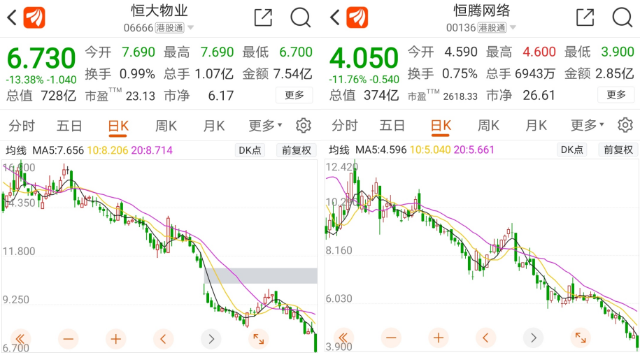 随后,恒大系集体大跌,截至收盘,中国恒大大跌超16%,恒大汽车暴跌近20%,恒腾网络跌近12%,恒大物业大跌13.38%,累计蒸发市值超740亿港元。另外,恒大系的债券亦集体大跌,“15恒大03”跌近13%、“19恒大02”跌超11%、“19恒大01”跌超11%。