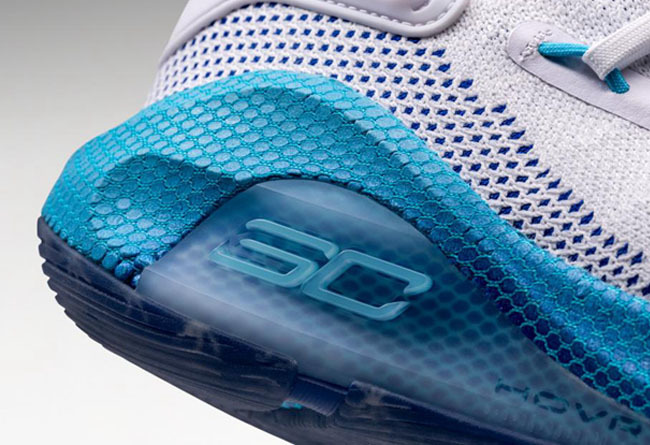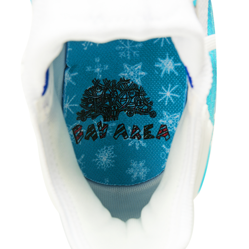 鞋身整体主要采用纯白色设计,十分契合圣诞节的冰雪氛围。鞋底、鞋带扣,鞋垫与外底等其他细节部分则用北卡蓝渲染,在鞋垫和鞋垫都设计手绘雪花图案点缀,同时纪念库里在北卡罗来纳州度过的童年时光。