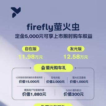 【售价11.98万起 firefly萤火虫正式上市】4月19日,firefly萤火虫正式上市,共推出2款车型,售价区间为11.98万元-12.58万元。外观方面,新车采用仿生学设计,车头两侧三重奏大灯由三个圆形光环组成,搭配贯穿式“胶囊环”,看起来很具辨识度。此外还配备了92L前备厢。配色方面,该车共推出灵感紫、新生绿、悠然米、纯粹白、探索灰5款颜色。车身尺寸方面,其长宽高分别为4003/1781/1557mm,轴距为2615mm。内饰方面,新车采用双辐式平底多功能方向盘,搭配13.2英寸悬浮式中控屏,以及6英寸全液晶仪表和电子式怀挡,空调出风口采用了贯穿式设计。空间上,车内采用主副驾无隔断贯穿式通道,拥有27处储物空间,后排右侧座椅下还有超29升隐藏式储物区。智驾辅助系统方面,新车标配15项主动安全功能,11项辅助驾驶功能+7项泊车辅助功能,高速城快驾驶辅助覆盖率达99.99%。动力部分,该车将搭载后轴单电机,最大功率为105千瓦,0-100km/h加速时间8.2秒,最高车速150km/h。同时配备42.1kWh电池组,CLTC纯电续航里程为420公里。补能方面,新车未来将接入蔚来换电体系,配备自适应能量回收功能。值得关注的是,firefly萤火虫目前暂不支持BaaS电池租用方案,将于8月1日正式启用。