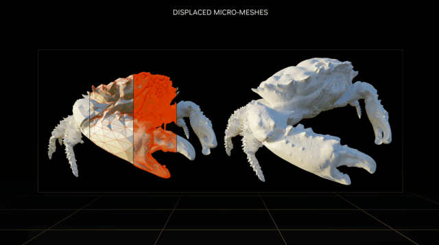 Displaced Micro-Mesh Engines可理解为微网格置换引擎,它构建光线追踪的BVH(Bounding volume hierarchy)的速度提高了10倍!所使用的的显存减少了20倍!