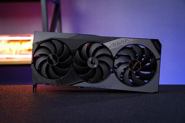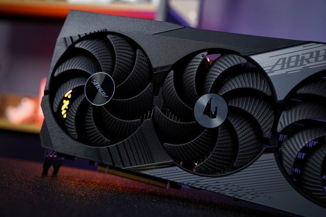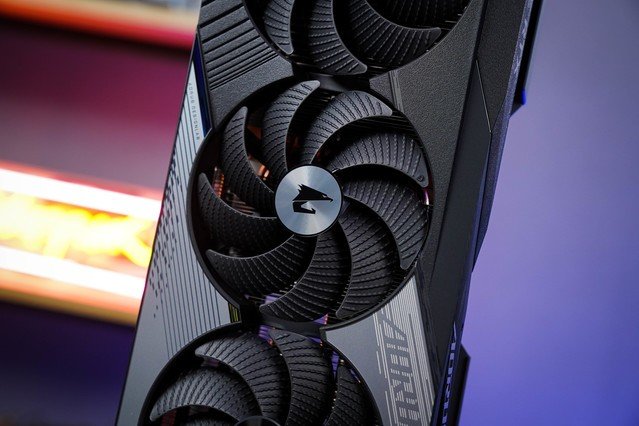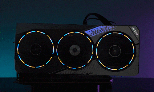 显卡右上角的“AORUS”字样采用RGB可发光设计,三枚风扇的周围也保留了经典的三环灯效配合GIGABY TECONTROL CENTER(GCC)可以实现丰富的灯效控制,也能够与其他的设备实现光效同步。