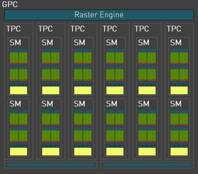 至此,每2个SM单元组成一个TPC单元,每6组TPC单元组成一个完整的GPC顶层单元(在部分核心中,会出现5组TPC组成一个GPC单元的情况)。