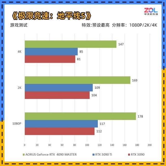 首先在《地平线5》中,可以明显看到,不止在1080p分辨率下,即使在2K分辨率中,受限CPU的情况依然明显。作为一款标准的3A游戏,在4K分辨率下依然可以跑到147帧,这在以前绝对是无法想象的。