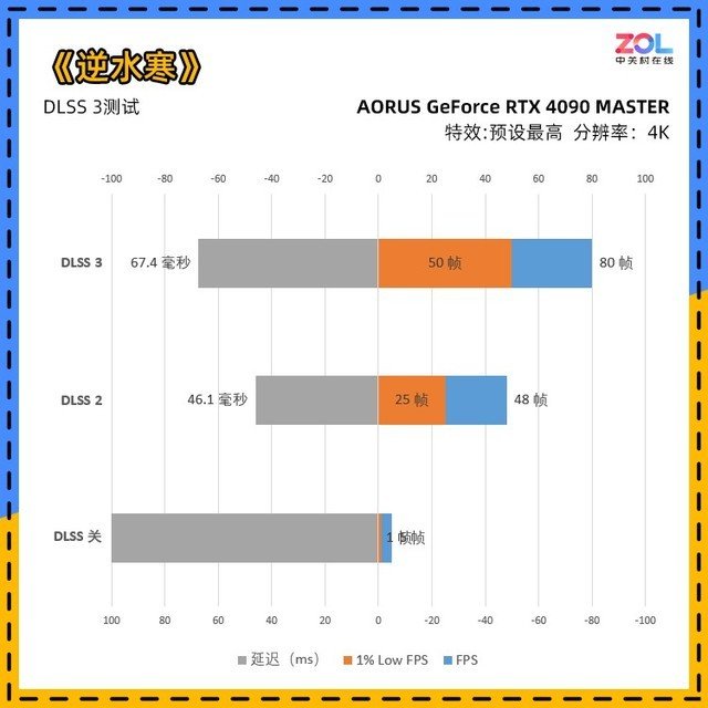 在尝试关闭DLSS运行后,帧数仅有个位数,而延迟早已上万。还记得在纯光线追踪软件中测试的《光明记忆无限》和《边境》,在本次只有DLSS2 的情况下都能够达到80帧左右。而《逆水寒》这款真正意义上的全局光照,在DLSS2 开启后仅有48帧左右,着实恐怖。不过在开启DLSS3 的情况下,4K分辨率也来到了80帧,已经可以保证基本的游戏体验了。