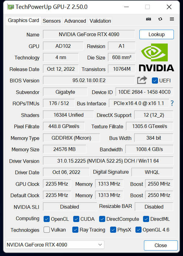 首先看一下GPU-Z的参数,AORUS GeForce RTX 4090 MASTER 采用AD102核心,采用TSMC 4nm 定制工艺(TSMC4 nm NVIDIA Custom Process),芯片面积608平方毫米,这里相对于RTX30 系的GA102的628平方毫米更小。