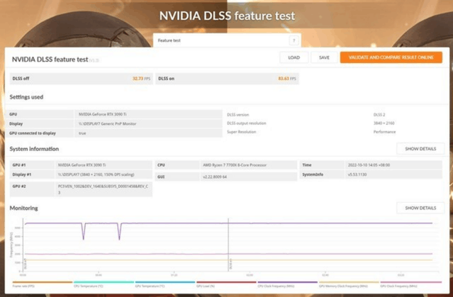 另外我们也测试了GeForce RTX 3090 Ti 在该程序下成绩,其中DLSS关闭为32.73帧,由于不支持DLSS3,所以在DLSS2 下的成绩为83.63帧。