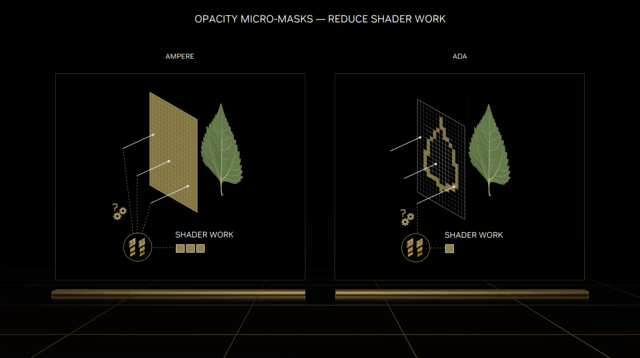 在第三代RT Cores中引入了两个重要的硬件单元,首先是Opacity Micro-Map Engines,可以理解为微映射透明度引擎,它主要的作用是优化光线追踪渲染,可大幅减轻着色器的工作负担。