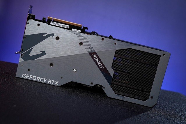 AORUS GeForce RTX 4090 MASTER的背面同样运用了拉丝和磨砂两种工艺,银色的金属拉丝和灰色的磨砂设计融于一体,配合中心位置可发光的“AORUS”品牌印记,效果非常炫酷。