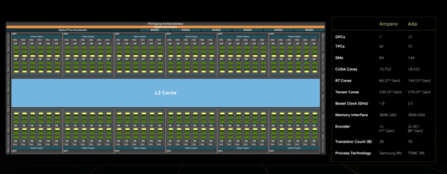 完整的AD102核心共有18432个CUDA,其中包含12个图形处理集群(GPCs), 72个纹理处理集群(TPCs), 144个流式多处理器(SMs)。144个第三代光追核心(RT Cores)、576个第四代张量核心(Tensor Cores)。另外可以看到Boost频率也从1.9GHz猛增到了2.5GHz。