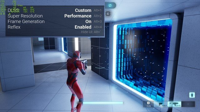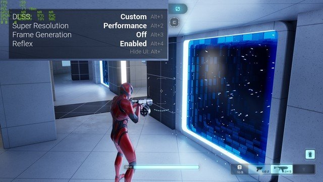 在UE5提供的测试游戏中,方便的给出了DLSS的快捷测试,这里分为DLSS关(超分辨率关+帧生成关+Reflex关);DLSS2(超分辨率性能+帧生成关+Reflex开);DLSS3(超分辨率性能+帧生成开+Reflex开)三档测试。