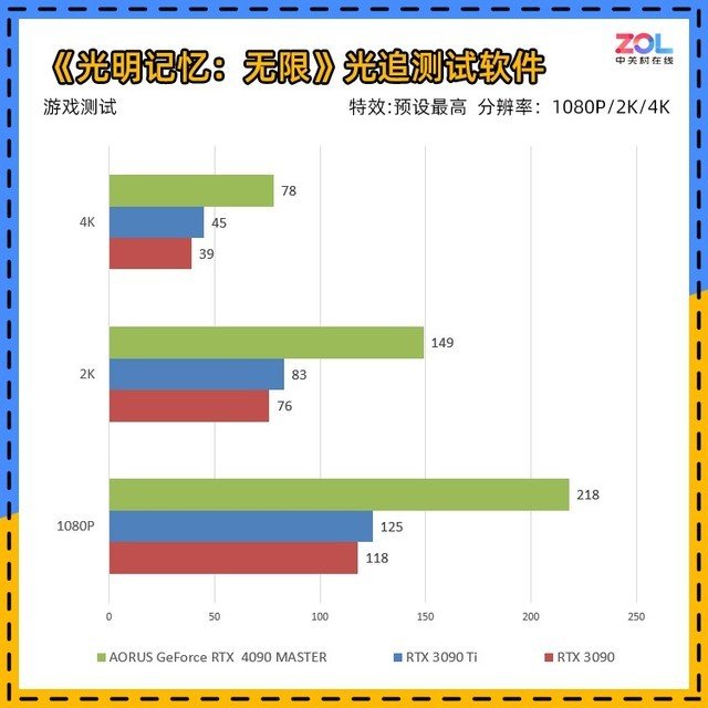 《光明记忆:无限》的光追测试软件是独立于游戏的测试工具,比游戏中用到的光线追踪技术更多,测试条件为“RTX最高/DLSS质量”。所以测试帧数相对较低,但实际游戏配置相当亲民。作为最老牌的光追性能测试工具之一,《光明记忆:无限》已经陪伴了我们三代显卡,从初代20系列基本能用,到如今1080P下218fps、2K下149fps、4K分辨率也能取得78fps的性能表现,能够看到AORUS GeForce RTX 4090 MASTER的超强实力。