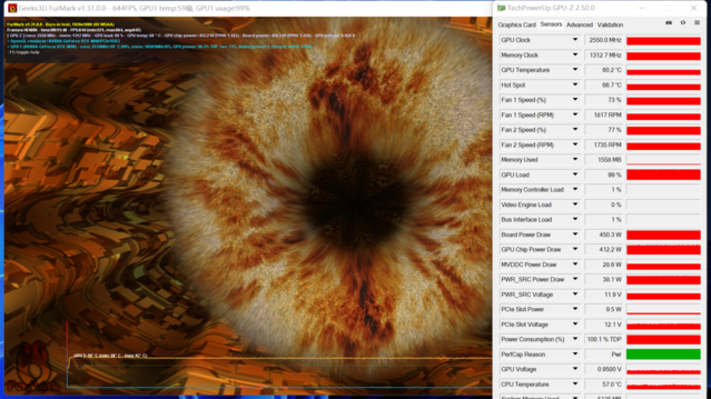 功耗测试中,我们选择FurMark软件进行拷机测试,并采用GPU-Z检测温度,功耗仅计算显卡自身。
