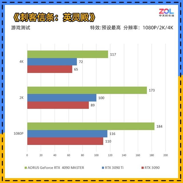 在一度被称为众生平等的《刺客信条:英灵殿》中,AORUS GeForce RTX 4090 MASTER 相比GeForce RTX 3090Ti 的提升分别为:1080p提升59%;2K提升73%;4K提升63%,综合提升65%。对于《英灵殿》来说,每一帧的fps提升都非常难得,而AORUS GeForce RTX 4090 MASTER在4K分辨率下取得了117的超高帧率,让4K120Hz 显示器在这款游戏上也终于有了用武之地。