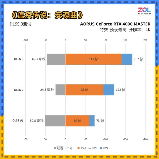 其中,AORUS GeForce RTX 4090 MASTER 在DLSS关的即时帧数为80帧,DLSS2 为155帧,DLSS3 为190帧。不过UE5这个测试的DLSS3 延迟为49.44ms,而DLSS2 为17.18ms,相对较高。